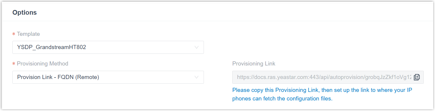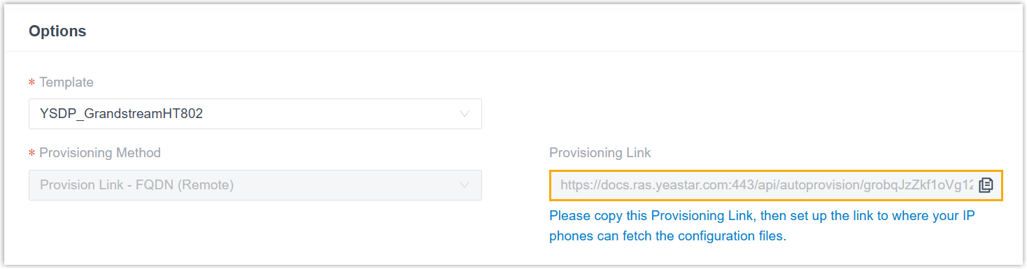 A provisioning link is automatically generated and displayed in the Provisioning Link field. This provisioning link points to the location where the gateway's configuration file is stored.
