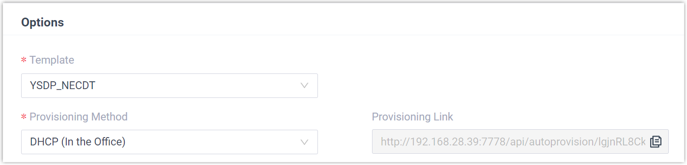 A provisioning link is automatically generated and displayed in the Provisioning Link field. This provisioning link points to the location where the phone's configuration file is stored.