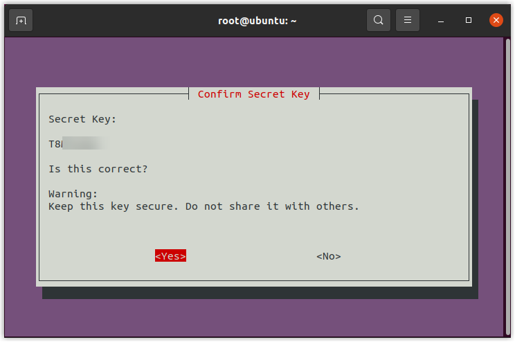 Confirm Secret Key window,