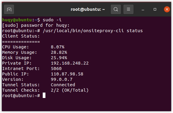 onsiteproxy-cli status.The command line shows the client status (system resource usage, IP address, port, client version, and connection status).Note: If the Tunnel Status is Abnormal, it indicates that the Onsite Proxy is connected to the PBX, but its system resource utilization has exceeded any of the following thresholds:- The CPU utilization exceeds 85%.