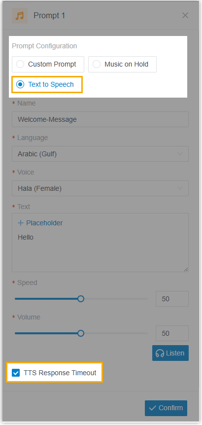When enabled, the component provides two branches TTS Playback Success and TTS Response Timeout, allowing you to set distinct flow paths based on the TTS generation result (success or timeout).