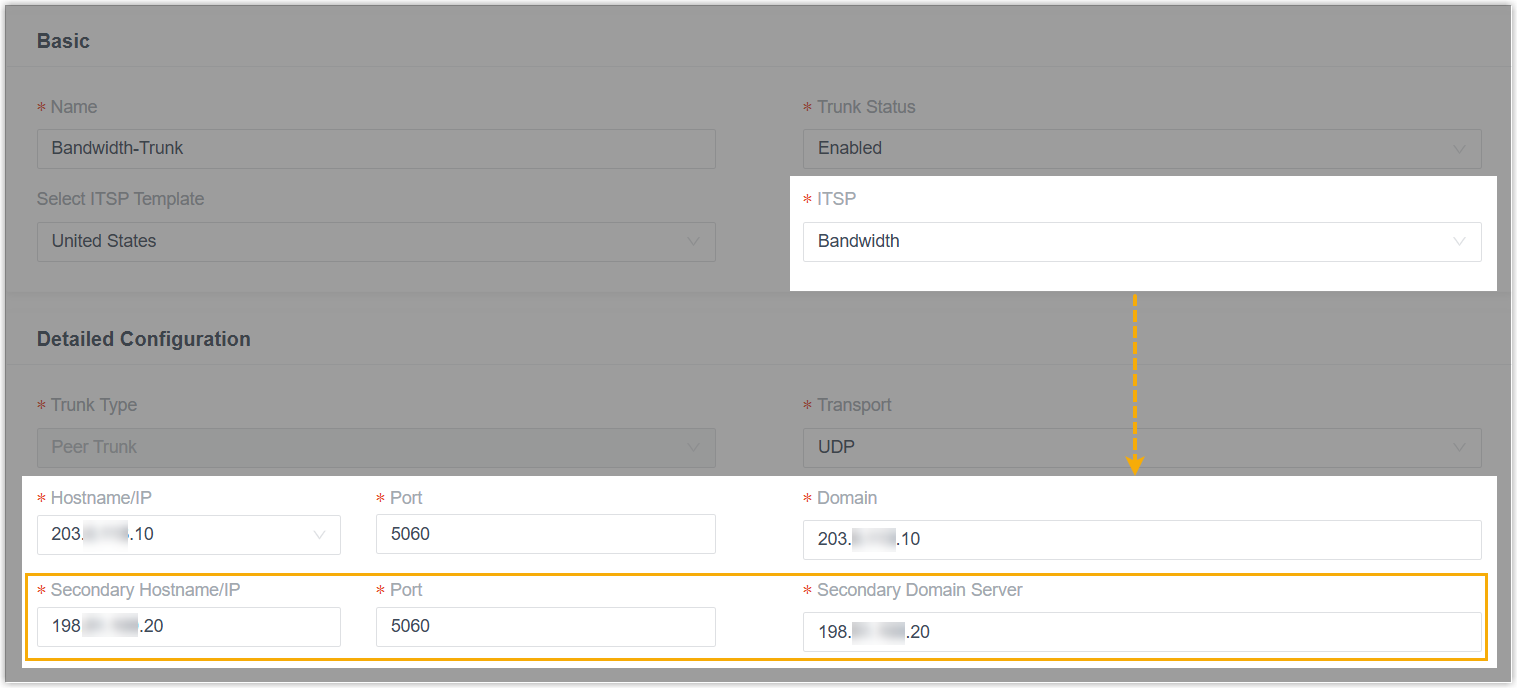 server settings when adding a trunk using the Bandwidth