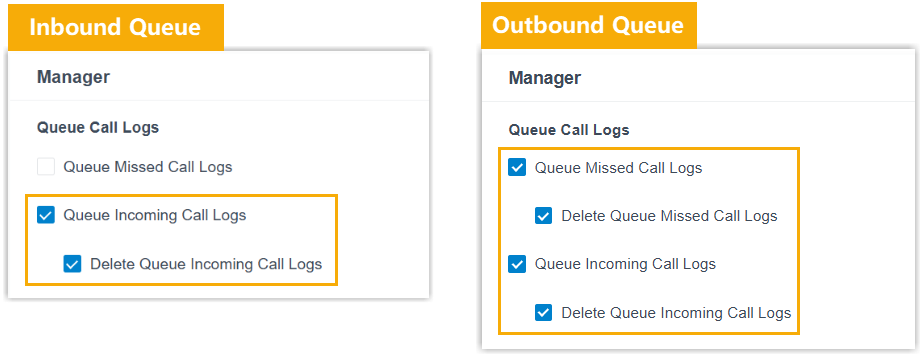 Configuration Item Description For outbound queue Queue Missed Call Logs When enabled, queue managers can view the call logs of all missed calls in the queue. Delete Queue Missed Call Logs When enabled, queue managers can delete the call logs of missed calls in the queue. Note: After deletion, all agents and managers in the queue cannot view the deleted records, but the records are still retained in the CDR.For inbound queue & outbound queue Queue Incoming Call Logs When enabled, queue managers can view call logs of all answered calls in the queue. Note: Only queue call logs generated in version 83.21.0.117 or later are accessible. Historical queue call logs prior to this version are not supported.Delete Queue Incoming Call Logs When enabled, queue manager can delete call logs of answered calls in the queue. Note: After deletion, all agents and managers in the queue cannot view the deleted records, but the records are still retained in the CDR. -