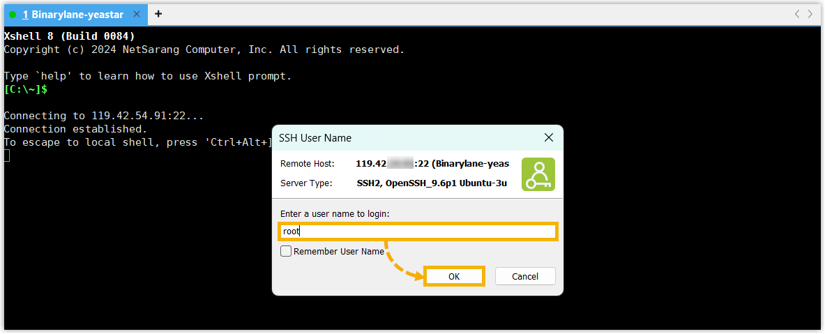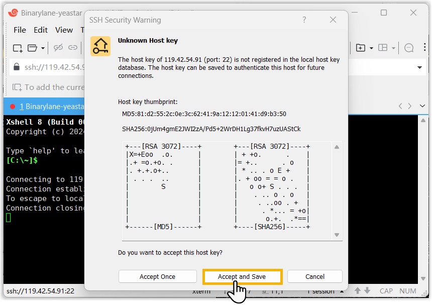 root@yeastar:~#prompt is displayed in the Xshell window after authentication, indicating that you have successfully connected to the cloud server.