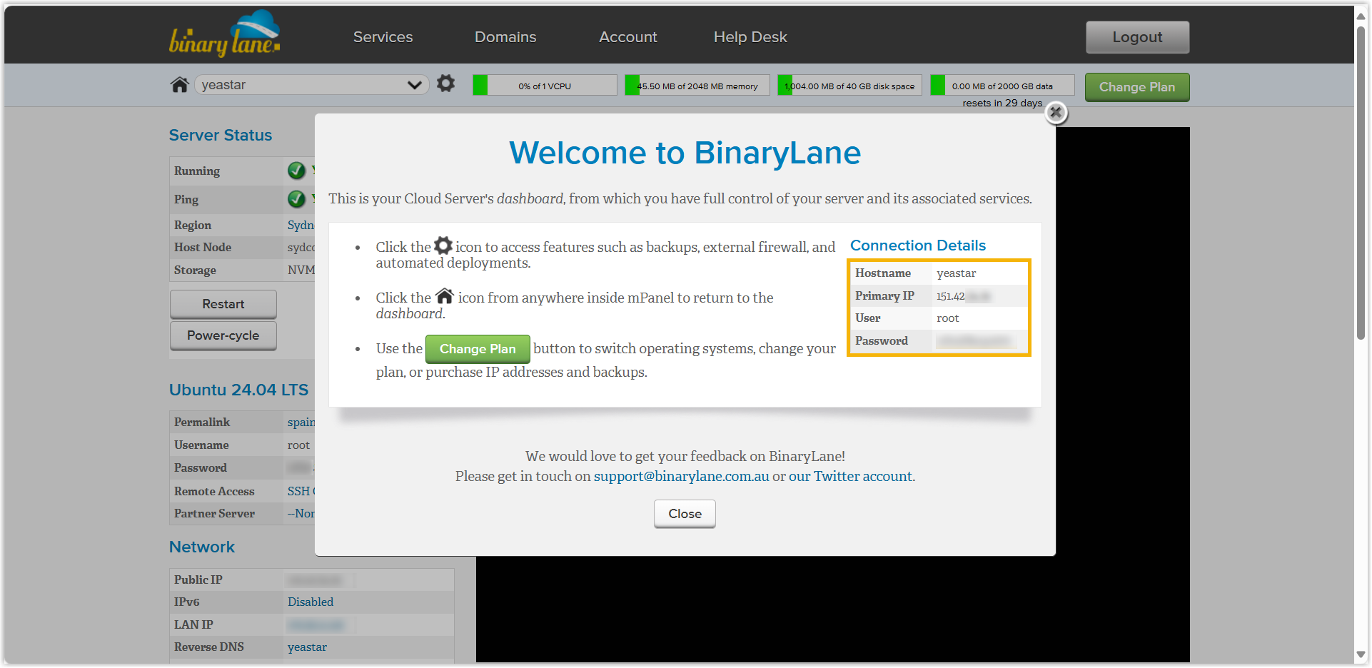The cloud server is successfully created. You will be redirected to the server's dashboard, where you can find the server's connection details (public IP address, user name and password).Tip: Be sure to save these connection details securely, as you will need them to connect to the cloud server.