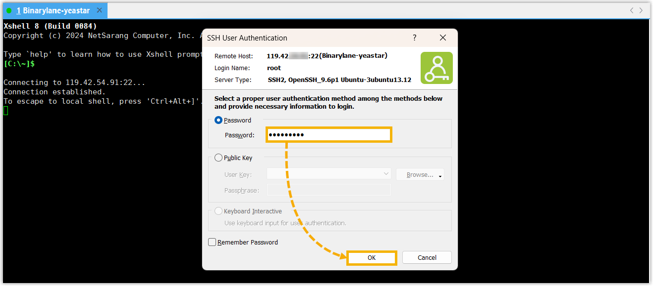 - Log in to the cloud server via SSH using the user name and password obtained from the cloud server's