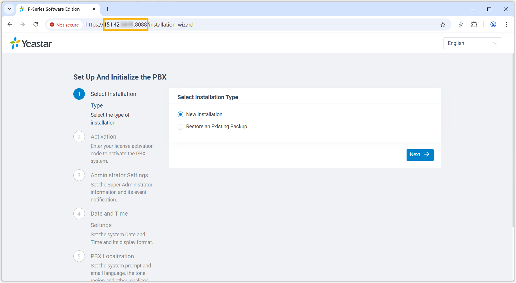 - Activate and initially set up Yeastar P-Series Software Edition following the installation wizard.
