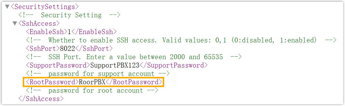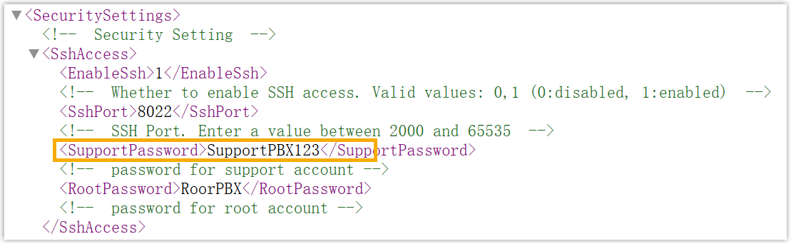 support, and password is the credential configured in PBX web portal (Path: ) or in XML configuration file.Figure 1. Support password in PBX web portal