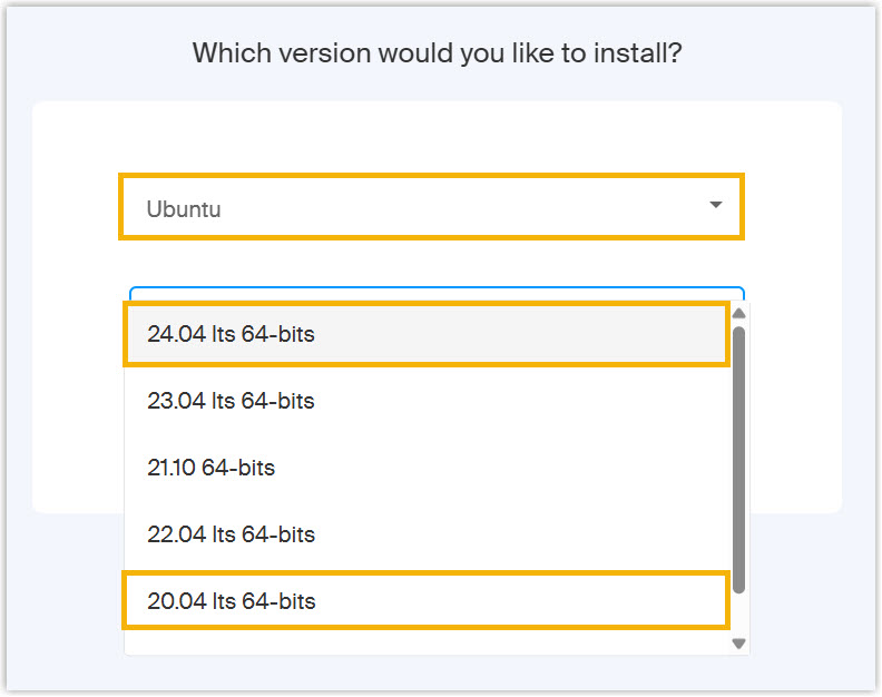 vCPU 2 2 4 6 8 Contact Yeastar Memory 2 GB 4 GB 4 GB 8 GB 16 GB Storage Call Recording Disabled 40 GB 40 GB 50 GB 100 GB 200 GB Call Recording Enabled 1 GB of storage holds approximately 1000 minutes of recorded calls. You can set up the storage based on your recording usage. - Select Ubuntu 24.04 lts 64-bits or Ubuntu