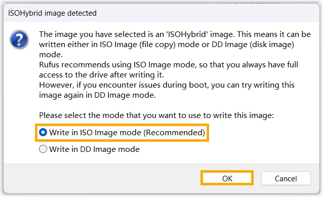 - In the pop-up window, select Write in ISO Image