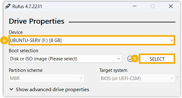 - In the Boot selection section, click SELECT to select the Ubuntu ISO image.