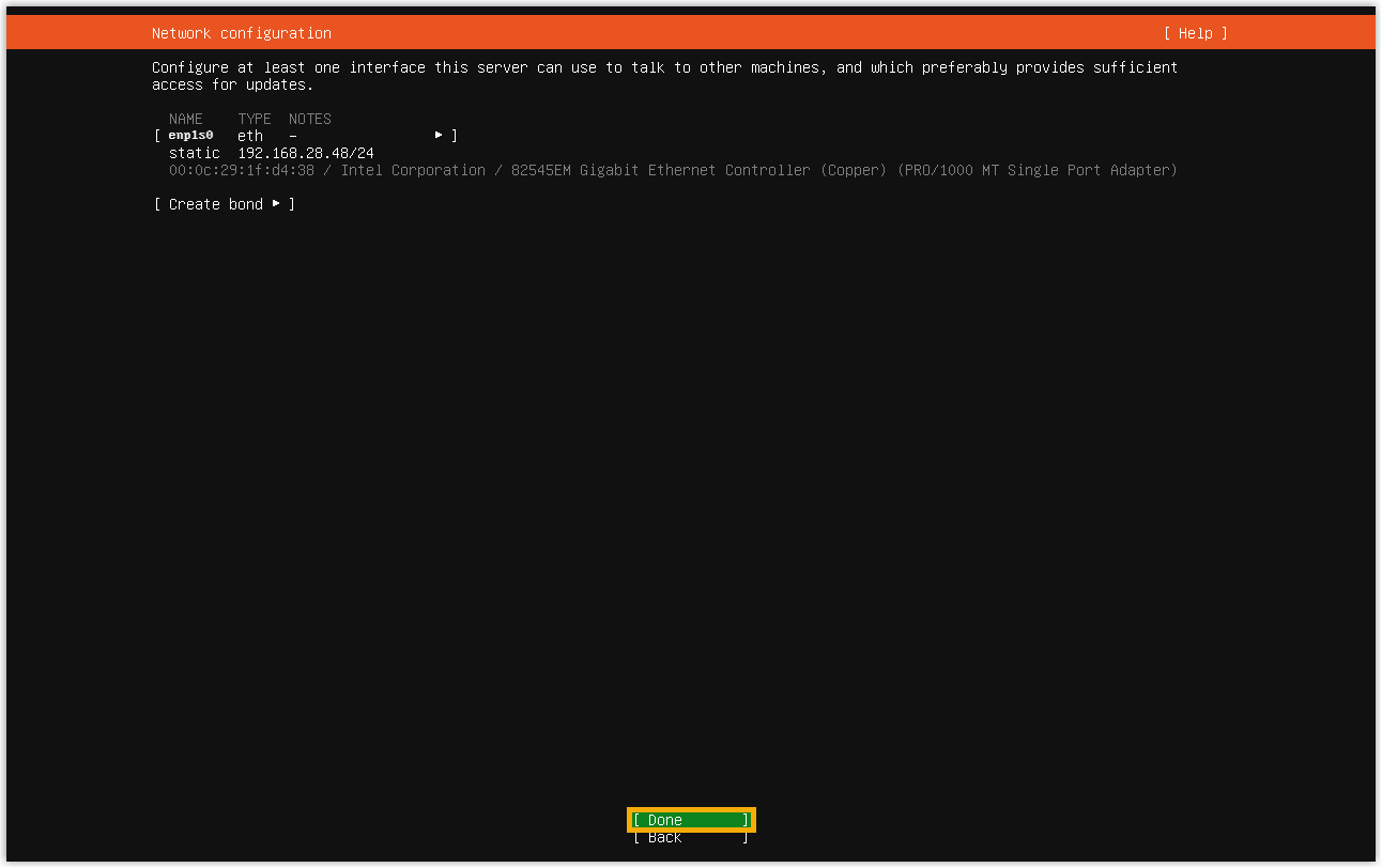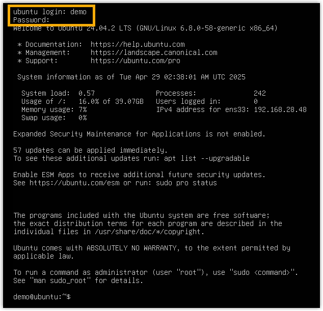 Note: Generally, you will NOT get any visual feedback from the screen when you type the password.You are presented with a prompt, displaying the Ubuntu information and system information. In the meanwhile, you are given the option to ping an IP address, view or update current network configuration, and log out the