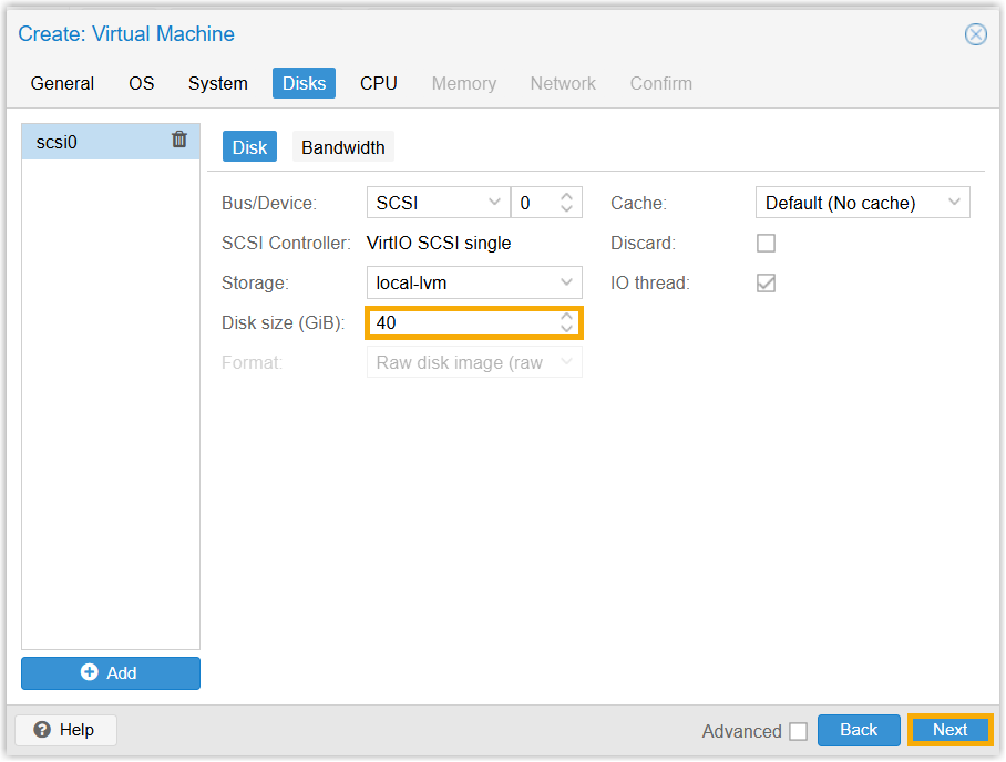 - On Disks tab, allocate at least 40 GiB in the