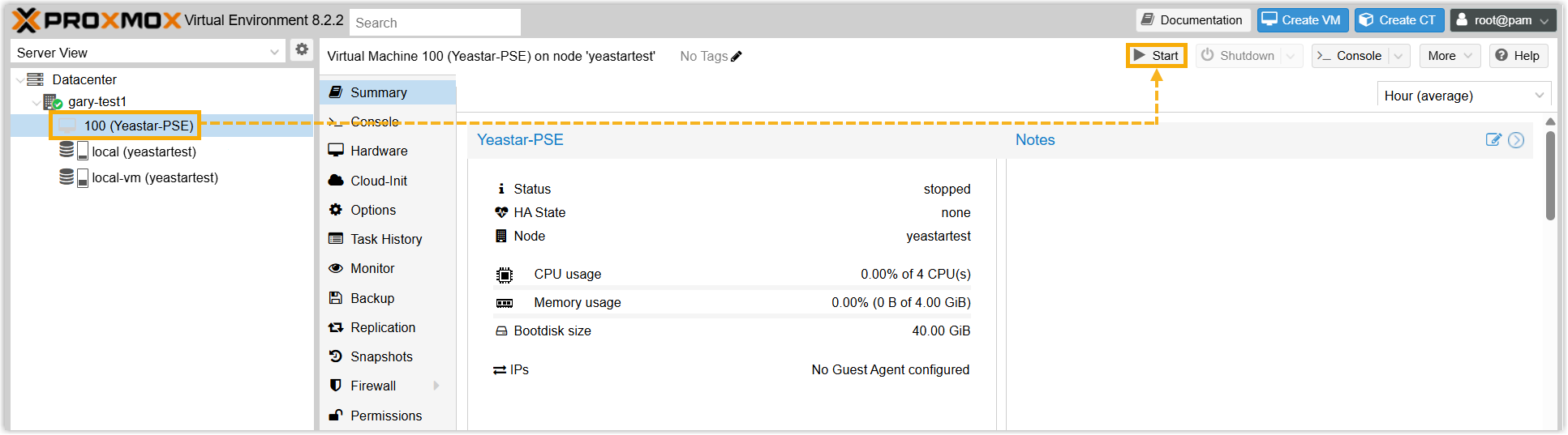 - Log in to Proxmox VE web-based management interface.