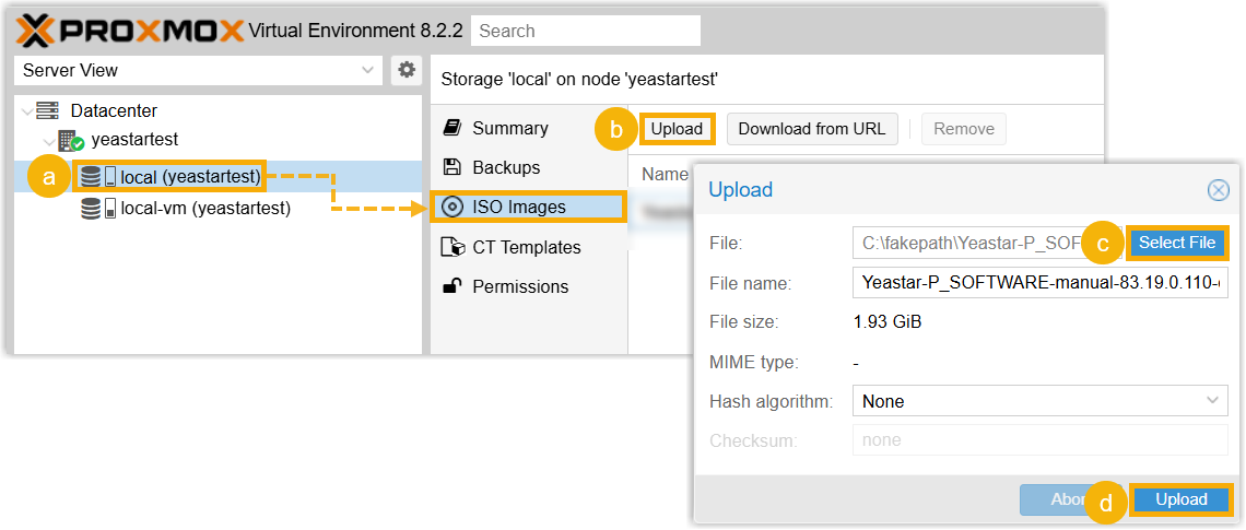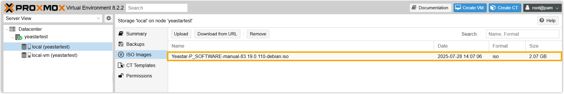 Step 1. Upload ISO image of Yeastar P-Series Software Edition to Proxmox VE
