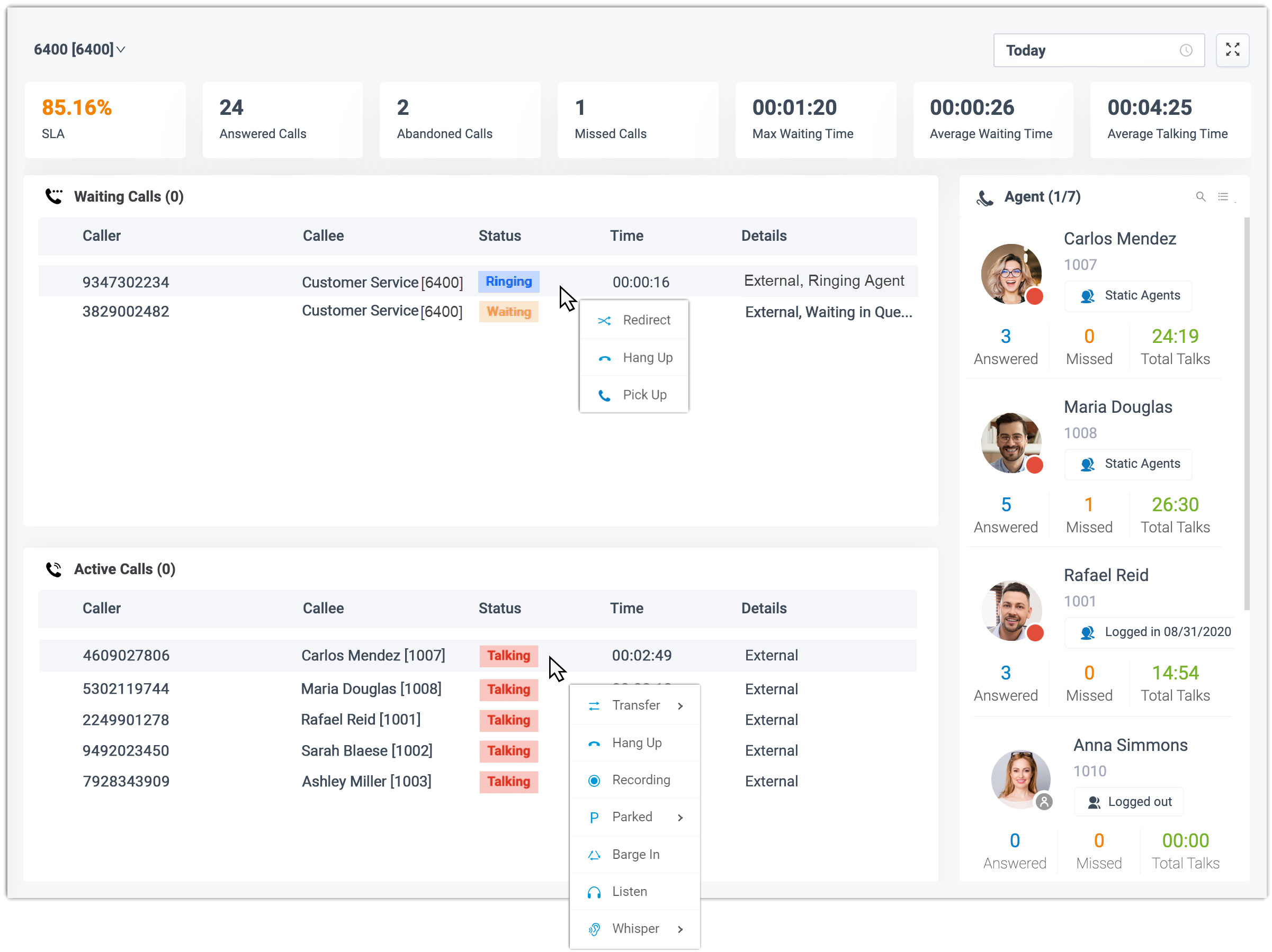 With an easy-to-use interface on Yeastar Queue Panel, you can view call statistics, change agent status, manage queue calls quickly and efficiently, and manage processing status of missed or abandoned queue calls.