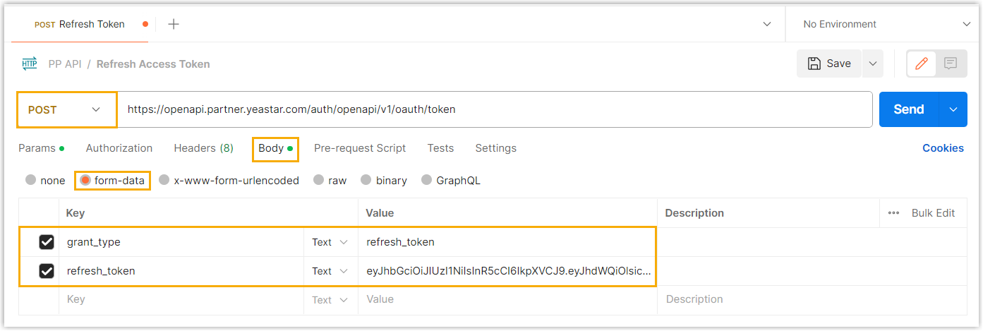 multipart/form-dataPOST /auth/openapi/v1/oauth/token HTTP/1.1 Host: openapi.partner.yeastar.com User-Agent: OpenAPI Content-Type: multipart/form-data; boundary=----WebKitFormBoundary7MA4YWxkTrZu0gW ------WebKitFormBoundary7MA4YWxkTrZu0gW Content-Disposition: form-data; name="grant_type" refresh_token ------WebKitFormBoundary7MA4YWxkTrZu0gW Content-Disposition: form-data; name="refresh_token" eyJhbGciOiJIUzI1NiIsInR5cCI6IkpXVCJ9.eyJhdWQiOlsicmVzMSJdLCJYLU1TLVVTRVIiOiJ7XCJleHByXCI6XCIwXCIsXCJ0eXBlXCI6XCJwYXJ0bmVyXCIsXCJ1Y0lkXCI6XCIzMDc2OTEzNjQ0ODkwODMyODk2XCIsXCJ1c2VyQ29kZVwiOlwiRGlzdHJpYnV0b3JcIixcInVzZXJJZFwiOlwiMzA3NjkxMzY0NDkxNTk5ODcyMFwiLFwidXNlcm5hbWVcIjpcImRpc3RyaWJ1dG9yZXhhbXBsZUBvdXRsb29rLmNvbVwifSIsInVzZXJfbmFtZSI6ImRpc3RyaWJ1dG9yZXhhbXBsZUBvdXRsb29rLmNvbSIsInNjb3BlIjpbImFsbCJdLCJhdGkiOiIyNkIxVXhEZ1NEc1RadzhPeHFPYkVtSjE2bEU9IiwiZXhwIjoxNzA5Nzk3NjcxLCJ0b2tlbl90eXBlIjoib3BlbmFwaSIsImF1dGhvcml0aWVzIjpbIjc3Il0sImp0aSI6IlkwWHQ4Sm91aEV1WGNZaXM3ZEFTR0lVY1B3dz0iLCJjbGllbnRfaWQiOiJhYzBmMmU1YmVlNzZiNmQ3ZjQ1NDU2OTZjMjRmYzFmMyJ9.l24t48t5iCQ01EToAdgVLsSASF6GFl8wOM-IANEKjho ------WebKitFormBoundary7MA4YWxkTrZu0gW--Figure 1. Request example in Postman