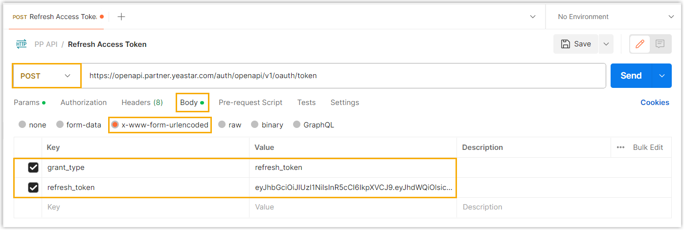 application/x-www-form-urlencodedPOST /auth/openapi/v1/oauth/token HTTP/1.1 Host: openapi.partner.yeastar.com User-Agent: OpenAPI Content-Type: application/x-www-form-urlencoded grant_type=refresh_token&refresh_token=eyJhbGciOiJIUzI1NiIsInR5cCI6IkpXVCJ9.eyJhdWQiOlsicmVzMSJdLCJYLU1TLVVTRVIiOiJ7XCJleHByXCI6XCIwXCIsXCJ0eXBlXCI6XCJwYXJ0bmVyXCIsXCJ1Y0lkXCI6XCIzMDc2OTEzNjQ0ODkwODMyODk2XCIsXCJ1c2VyQ29kZVwiOlwiRGlzdHJpYnV0b3JcIixcInVzZXJJZFwiOlwiMzA3NjkxMzY0NDkxNTk5ODcyMFwiLFwidXNlcm5hbWVcIjpcImRpc3RyaWJ1dG9yZXhhbXBsZUBvdXRsb29rLmNvbVwifSIsInVzZXJfbmFtZSI6ImRpc3RyaWJ1dG9yZXhhbXBsZUBvdXRsb29rLmNvbSIsInNjb3BlIjpbImFsbCJdLCJhdGkiOiI3aWhRdlplVU85VU5XY2Mzem9XVXowVVFUTm89IiwiZXhwIjoxNzA5Nzg5MTk1LCJ0b2tlbl90eXBlIjoib3BlbmFwaSIsImF1dGhvcml0aWVzIjpbIjc3Il0sImp0aSI6IkJSUE85aUYwclplNHMrOGdURThveTh1TlVmTT0iLCJjbGllbnRfaWQiOiJhYzBmMmU1YmVlNzZiNmQ3ZjQ1NDU2OTZjMjRmYzFmMyJ9.pcn0Psd9s9LvMpM-kGA5rJ797XdMMxf0h6-K6UcPxc0Figure 2. Request example in Postman