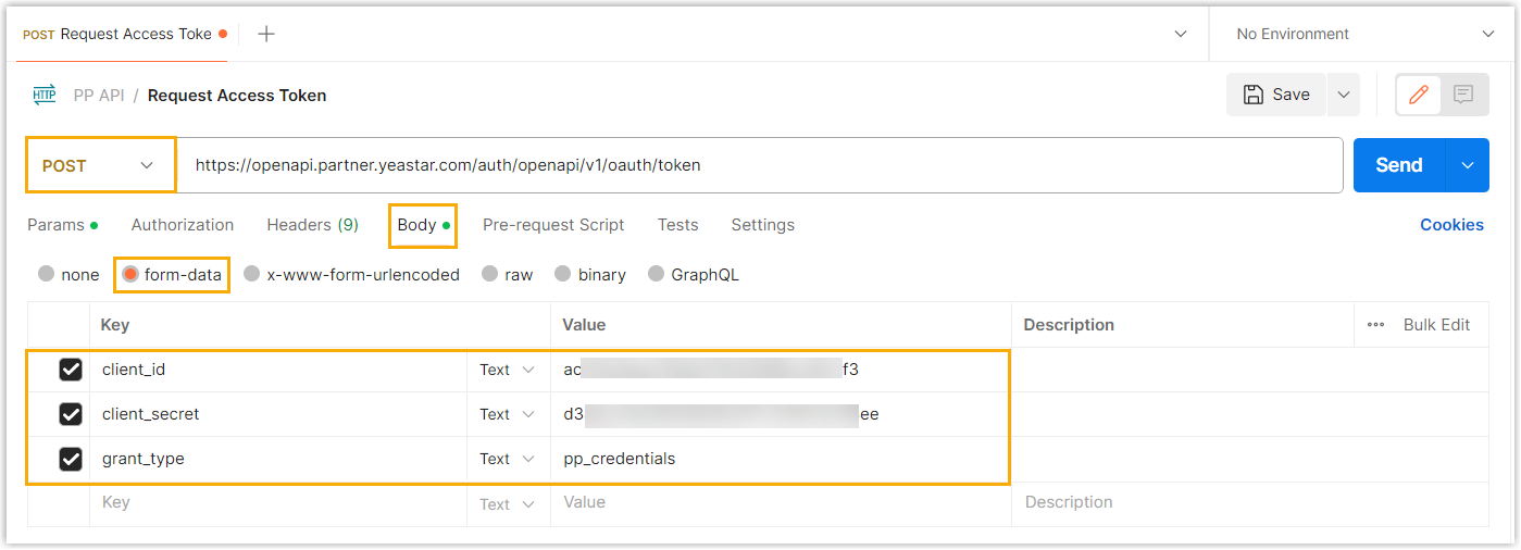 multipart/form-dataPOST /auth/openapi/v1/oauth/token HTTP/1.1 Host: openapi.partner.yeastar.com User-Agent: OpenAPI Content-Type: multipart/form-data; boundary=----WebKitFormBoundary7MA4YWxkTrZu0gW ------WebKitFormBoundary7MA4YWxkTrZu0gW Content-Disposition: form-data; name="client_id" acxxxxxxxxxxxf3 ------WebKitFormBoundary7MA4YWxkTrZu0gW Content-Disposition: form-data; name="client_secret" d3xxxxxxxxxxxee ------WebKitFormBoundary7MA4YWxkTrZu0gW Content-Disposition: form-data; name="grant_type" pp_credentials ------WebKitFormBoundary7MA4YWxkTrZu0gW--Figure 1. Request example in Postman