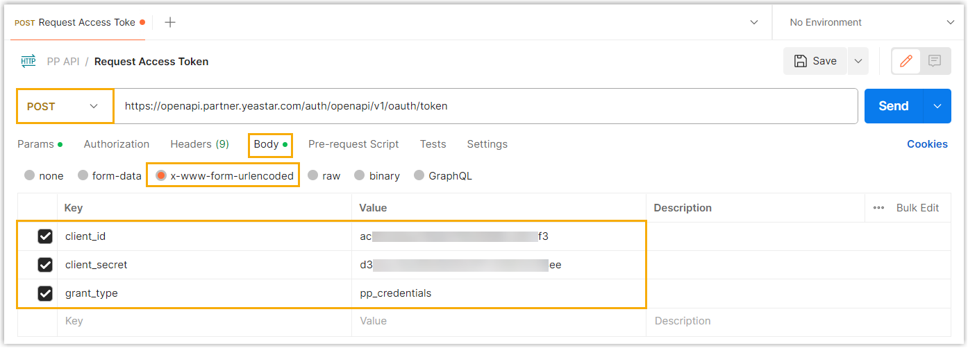application/x-www-form-urlencodedPOST /auth/openapi/v1/oauth/token HTTP/1.1 Host: openapi.partner.yeastar.com User-Agent: OpenAPI Content-Type: application/x-www-form-urlencoded client_id=acxxxxxxxxxxxxxf3&client_secret=d3xxxxxxxxxxee&grant_type=pp_credentialsFigure 2. Request example in Postman