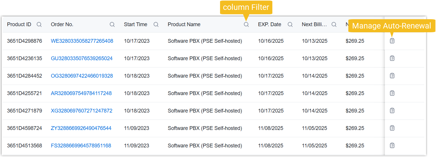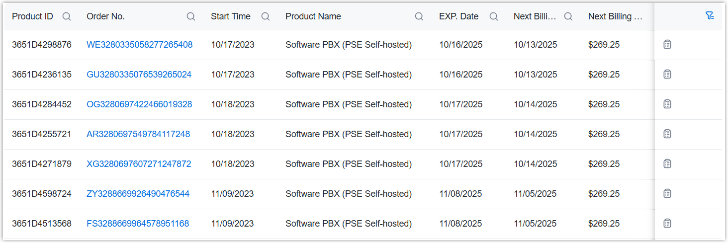 After you enable auto-renewal for subscription, Yeastar Partner Portal will send a reminder email to the billing contact 7 days before the subscription expires, and deduct the renewal fee 3 days in advance. To avoid subscription disruption, ensure that sufficient funds are available to cover the payment. You can check the upcoming renewal fee for existing subscriptions to stay prepared.