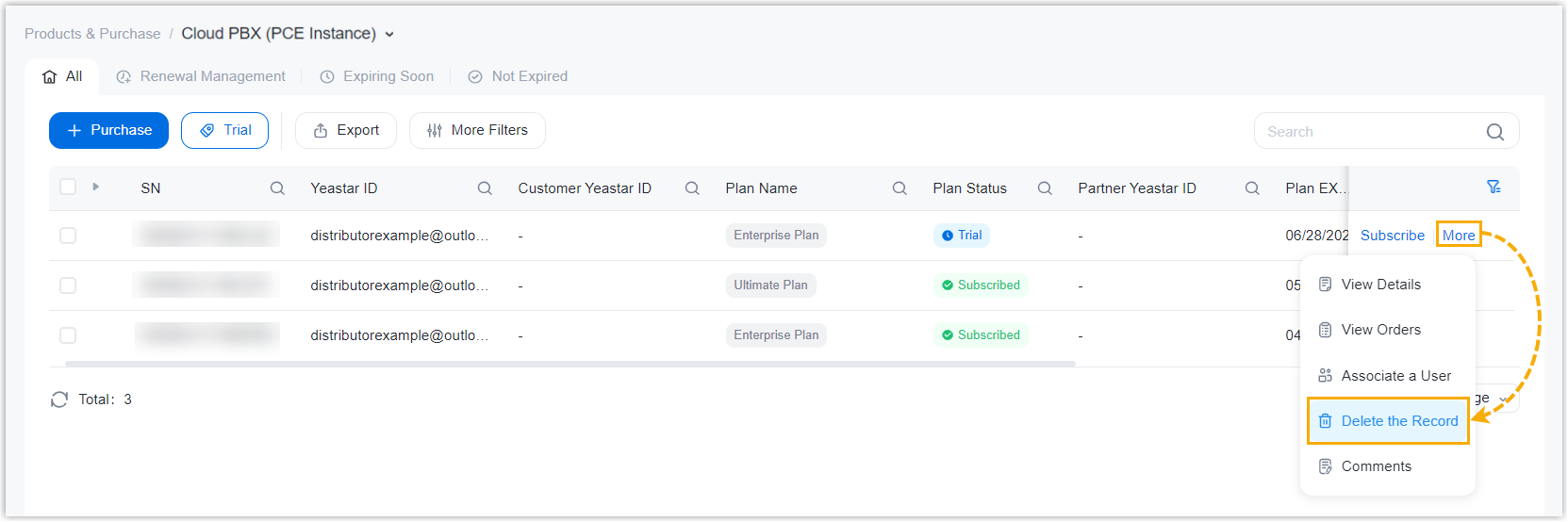 If your cloud PBX instance has expired, you can manually remove the record in Yeastar Partner Portal.