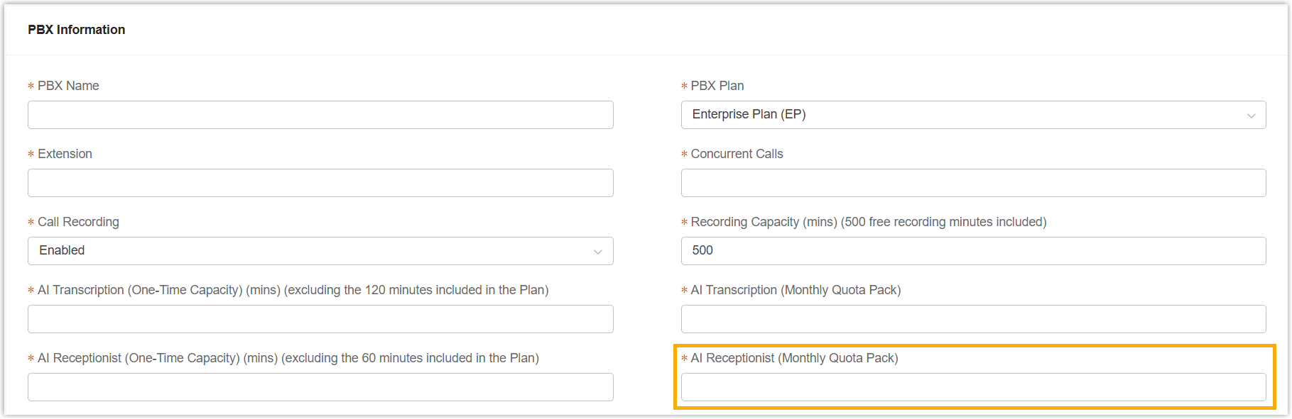 | AI Receptionist (Monthly Rolling Plan) | Pack-based subscription per Yeastar Partner Portal account. |