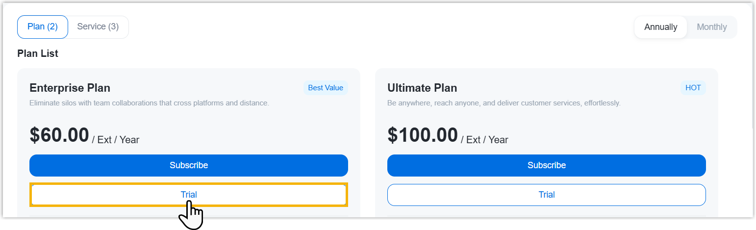 - Click Trial of the desired plan.