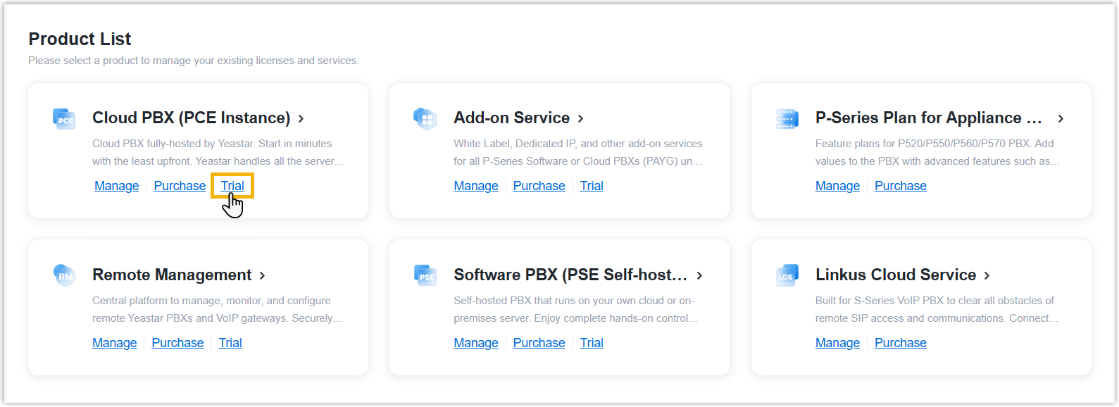 Yeastar provides you with the flexibility to deliver cloud-based communication services on demand, only paying for what you use, without the need for excess capacity. You can obtain a free trial for P-Series Cloud Edition to try out the features before subscribing to it.
