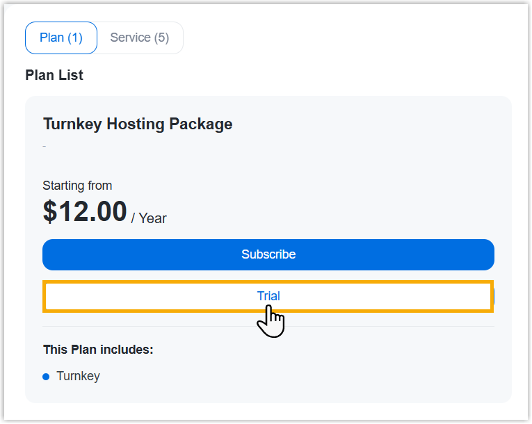 Under Plan tab, click Trial of Turnkey Hosting Package.
