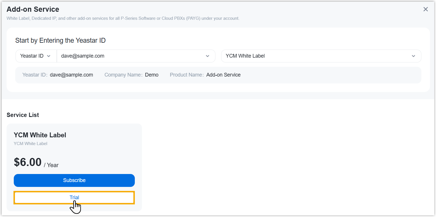 YCM white label trial has been activated for the selected user, and synchronized to the user's Yeastar Central Management (Path: ).