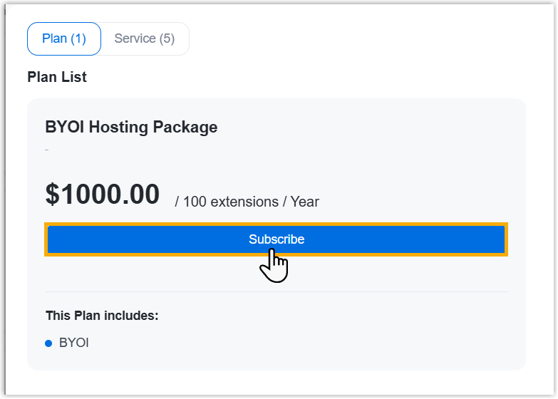 If you deliver cloud-based communication services with BYOI solution, you can purchase a hosting package on Yeastar Partner Portal. Whenever you receive a request from a customer for a P-Series Cloud PBX or from a subordinate for a hosting package, you can allocate capacity from your hosting package and resell it at your desired pricing model.