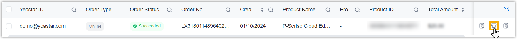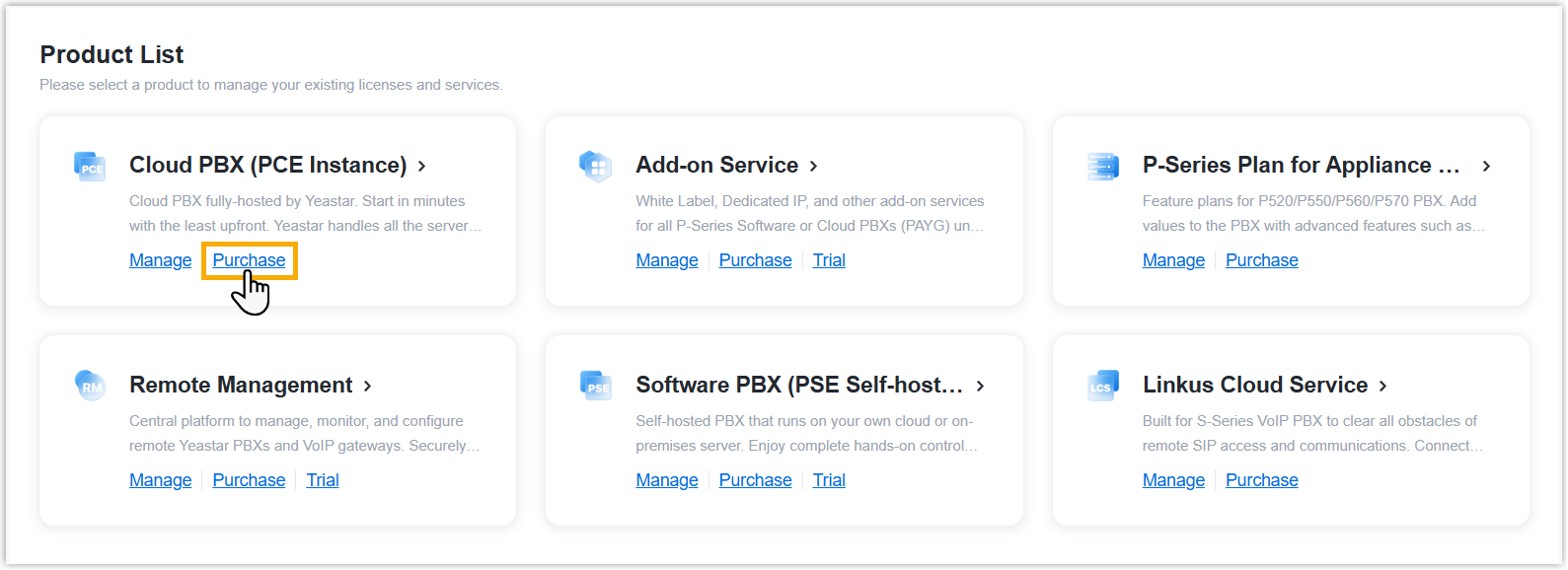 - Log in to Yeastar Partner Portal, go to Products & Purchase.