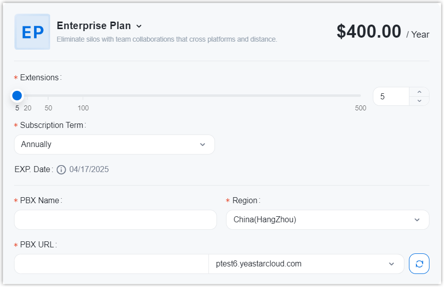 - PBX Name: Enter a name to help you identify the PBX instance on Yeastar Central Management.