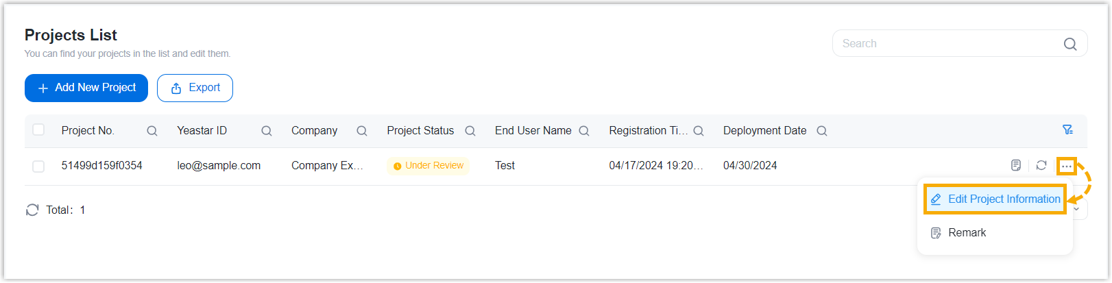 - Log in to Yeastar Partner Portal, go to , then click Add New Project.
