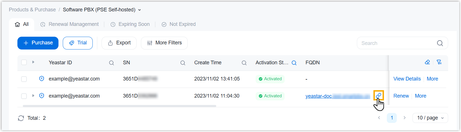 - Log in to Yeastar Partner Portal, go to Products & Purchase.