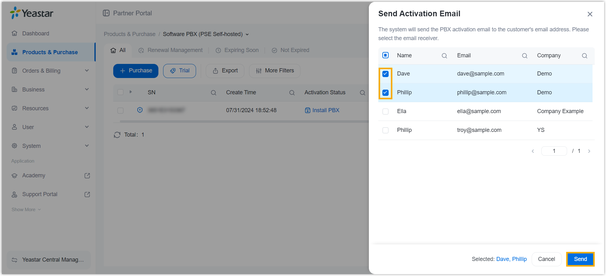 - Select the checkboxes of one or more users to receive the PBX activation