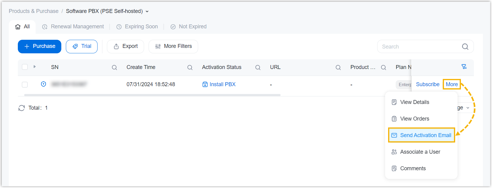 By default, the user to whom you assign the software PBX and you will receive a PBX activation email after you request a trial or purchase a commercial license. If you don't receive the email or if you want to send the email to your subordinate user, you can follow the guide to proceed.