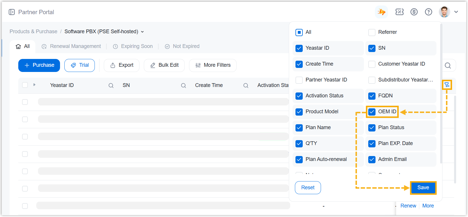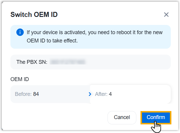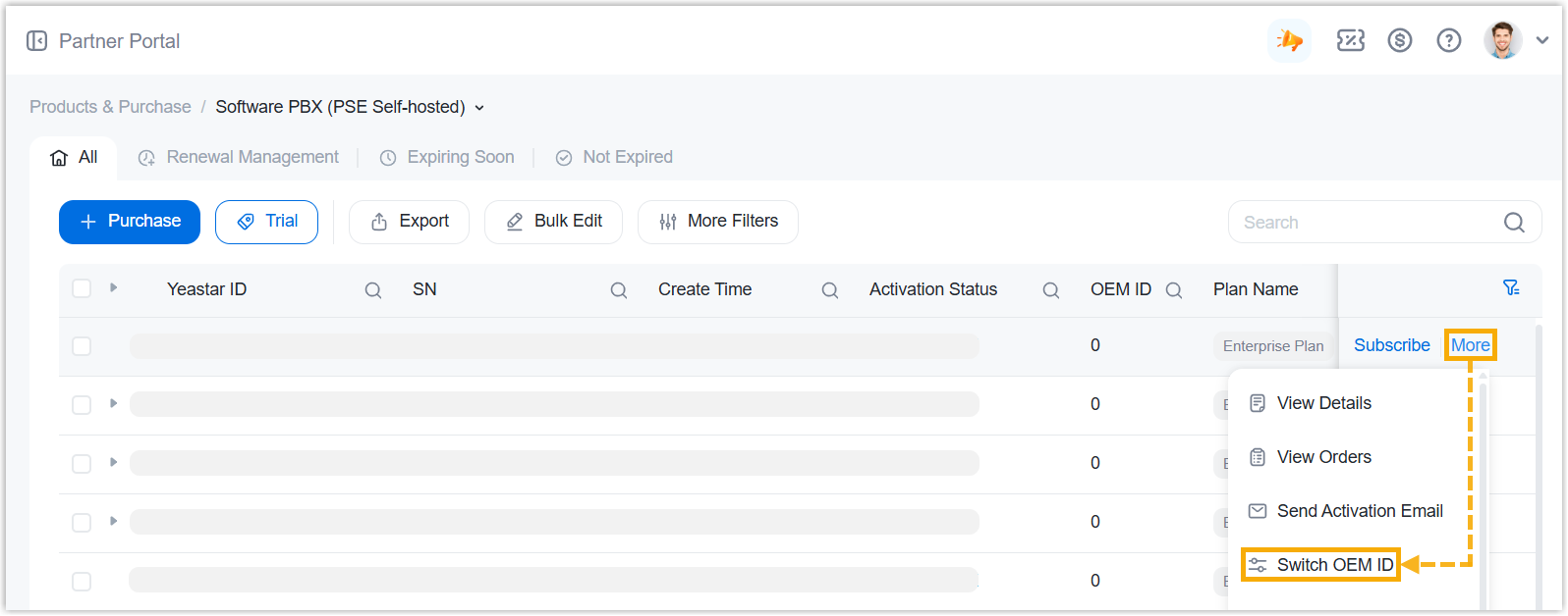 You can switch OEM ID for software PBXs directly from Yeastar Partner Portal. If the PBXs are remotely connected to Yeastar Central Management, you can also proceed from the portal.