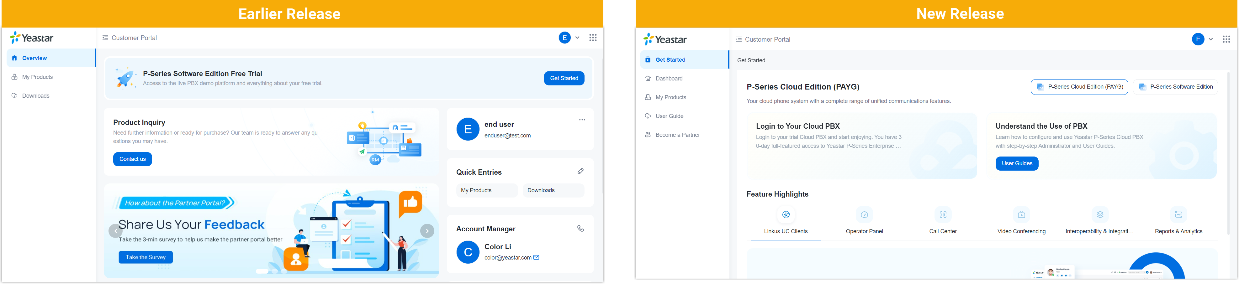 Yeastar Customer Portal. Earlier Release: End users can ONLY view the account information, query the subscription details, and access help resources. New Release: Beyond the previously supported operations, end users can apply for partnership with Yeastar, check feature highlights for products, and more. |