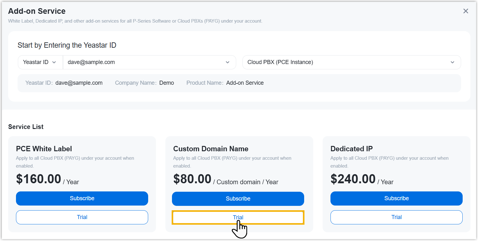 The free trial of PCE Custom Domain Name service has been enabled for the selected user, and synchronized to the user's Yeastar Central Management (Path: My Subscription).