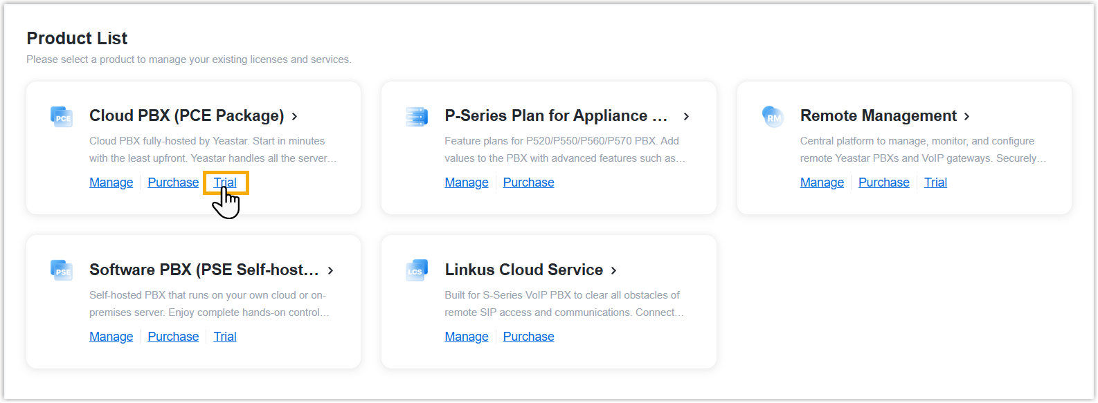 - On the product list, click Trial on Cloud PBX