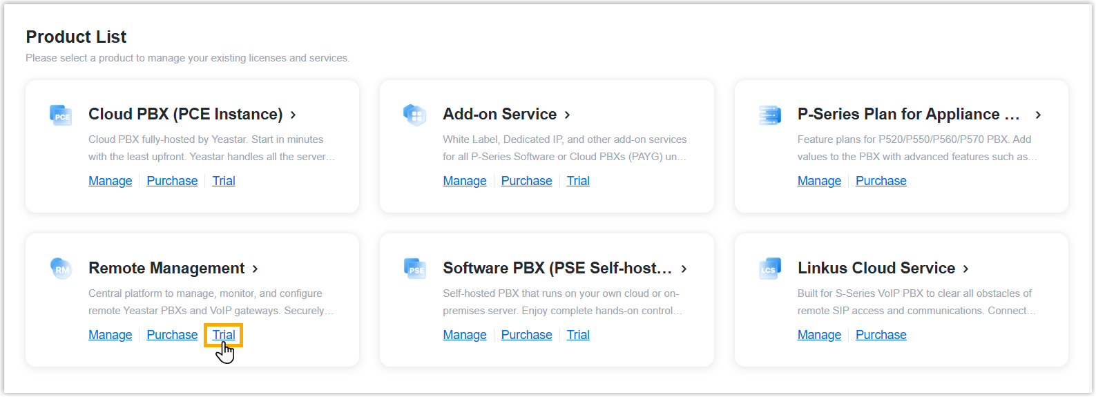 Remote Management service allows you to remotely connect to and access on-premises Yeastar PBXs and gateways through Yeastar Central Management. Yeastar offers a 30-day free trial for the service, enabling you to connect up to 10 devices and explore the features before subscribing.