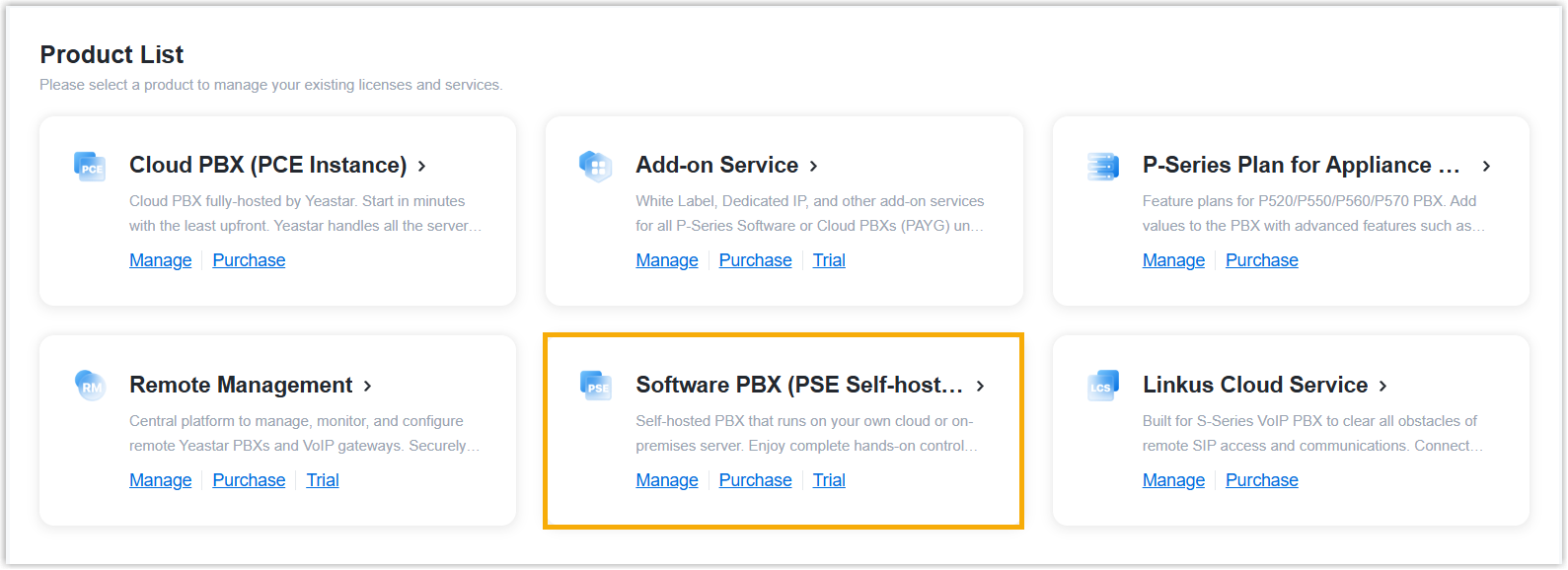 - On the product list, click Software PBX (PSE