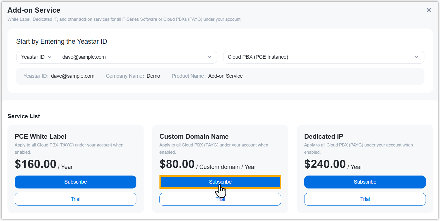 PCE Custom Domain Name service has been subscribed for the selected user, and synchronized to the user's Yeastar Central Management (Path: My Subscription).