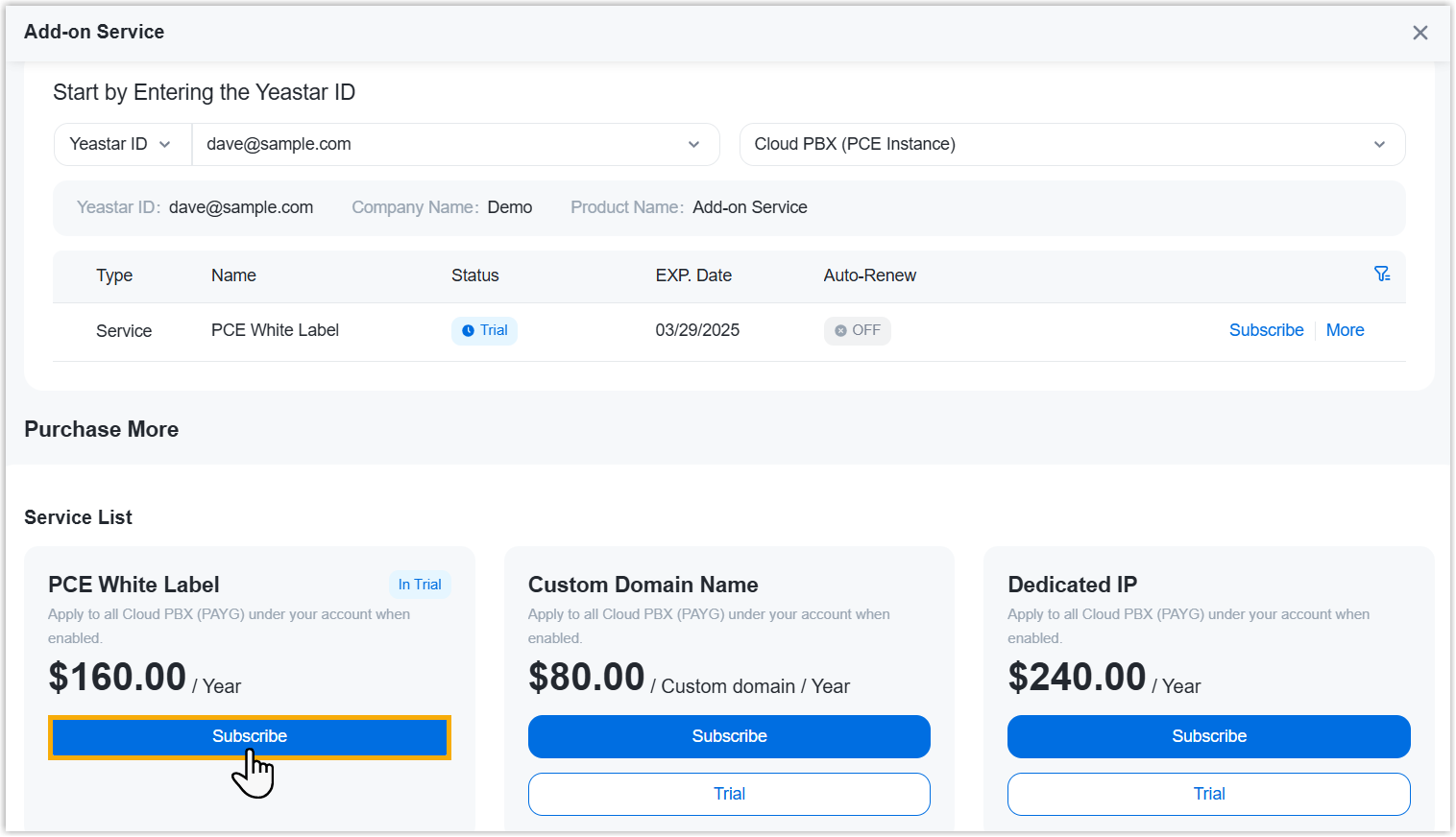 PCE white label service has been subscribed for the selected user, and synchronized to the user's Yeastar Central Management (Path: My Subscription).