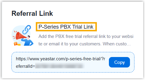 | Updated description | Updated description and screenshots for Referral Program, as a P-Series PBX Trial Link heading has been added to help distinguish it from the partnership application link. | ![]() |