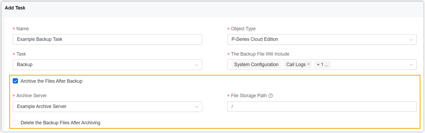 - Added support for downloading and archiving the backup files of P-Series Cloud PBX to external servers via FTP, SFTP, Amazon S3, and Google Cloud Storage services, enabling less space occupying and minimized data loss risk on Yeastar Central Management, as well as easier file management on external server.