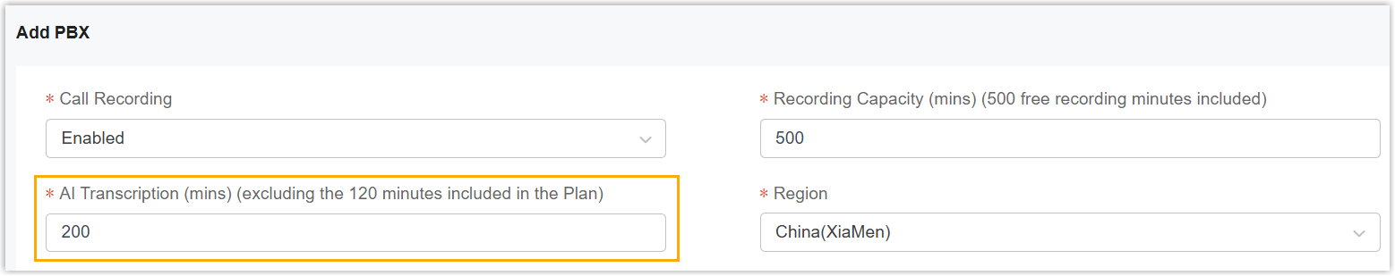 - AI Transcription(mins): Assign the number of AI transcription minutes that the subordinate user can assign to their PBXs.