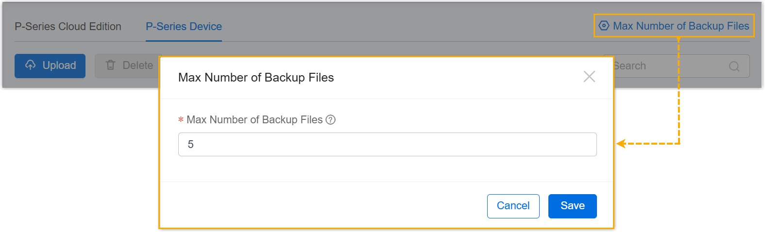- Optimized the Backup File feature: Added a configuration item Max Number of Backup Files, which allows you to set the maximum number of backup files that can be retained for each P-Series Cloud Edition or remotely connected P-Series Appliance/Software Edition on Yeastar Central Management, regardless of whether the backup files are generated by tasks or uploaded manually.